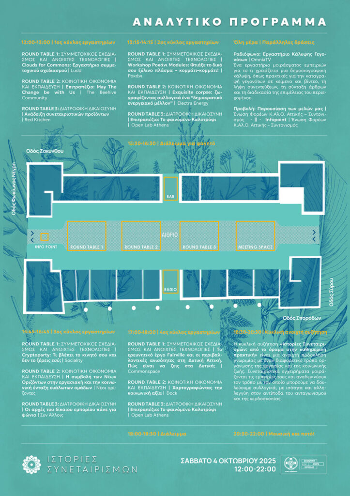 Με την συμμετοχή των συνεργατικών εγχειρημάτων: OmniaTV, Ludd, Ροκάνι, Open Lab Athens, Commonspace, Electra Energy, The Beehive Community, Dock, Red Kitchen, Sociality, ΣυνΆλλοις, Red n’ Noir, Birdland, Νέοι Ορίζοντες.